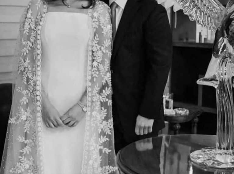 وظهرت خطيبة عون جمعة في الصور بفستان زهري طويل و”كاب أبيض” مطرز، مع مكياج بسيط وتسريحة شعر ناعمة، وفي إحدى الصور، وضع ابن الأميرة عائشة خاتم الخطبة في يد لينا عباس.