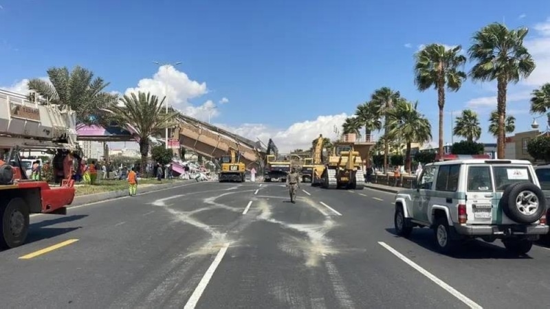 وجاء في البيان تعرض جسر مشاة على طريق الأمير سلطان للسقوط بعد اصطدامه بآلة نقل ثقيلة محملة بـ “بوكلين” وتم مخالفة أنظمة المرور من قبل سائق الآلة، حيث تجاوز ارتفاعها الحد المسموح به (5.5 متر).